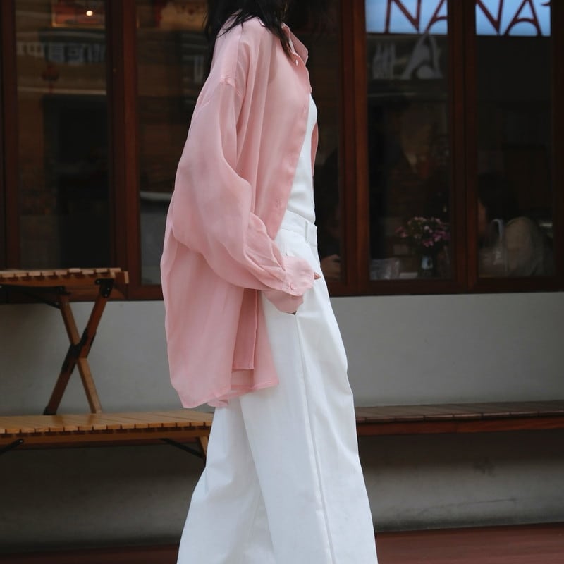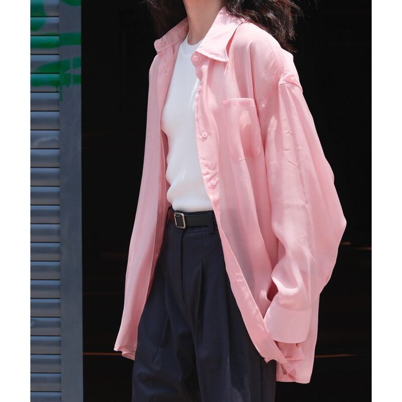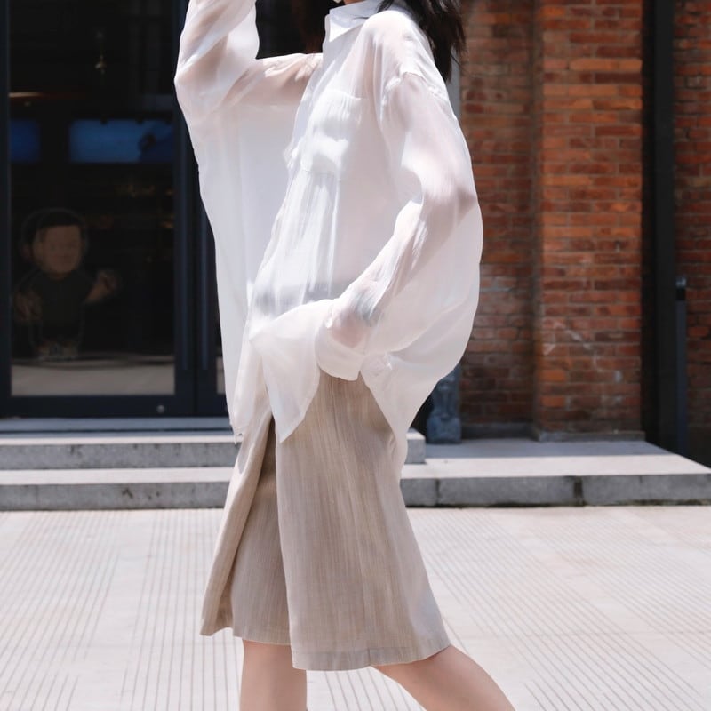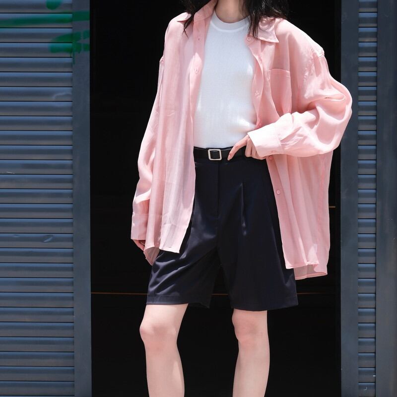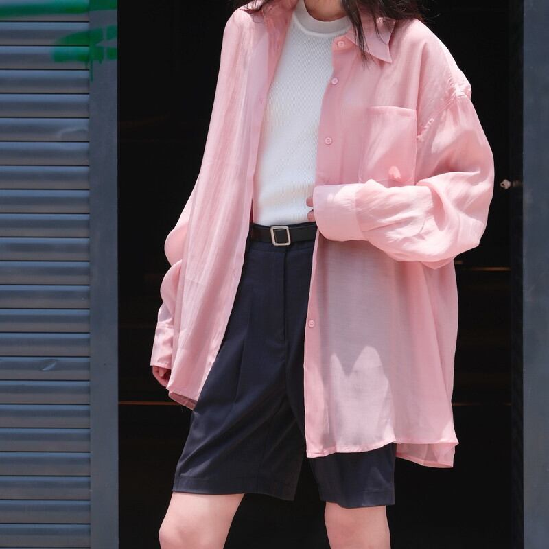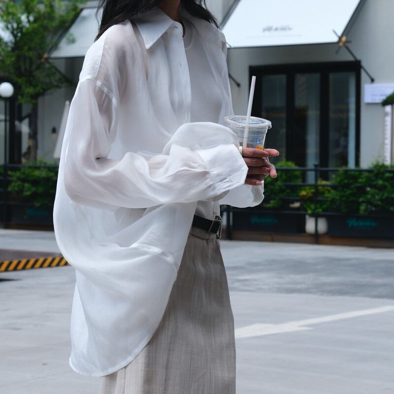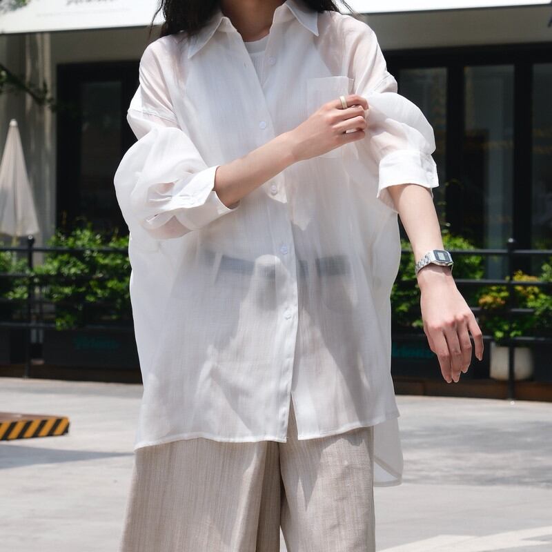 ▶︎シアー素材が軽やかで涼しげなロングシャツ。
