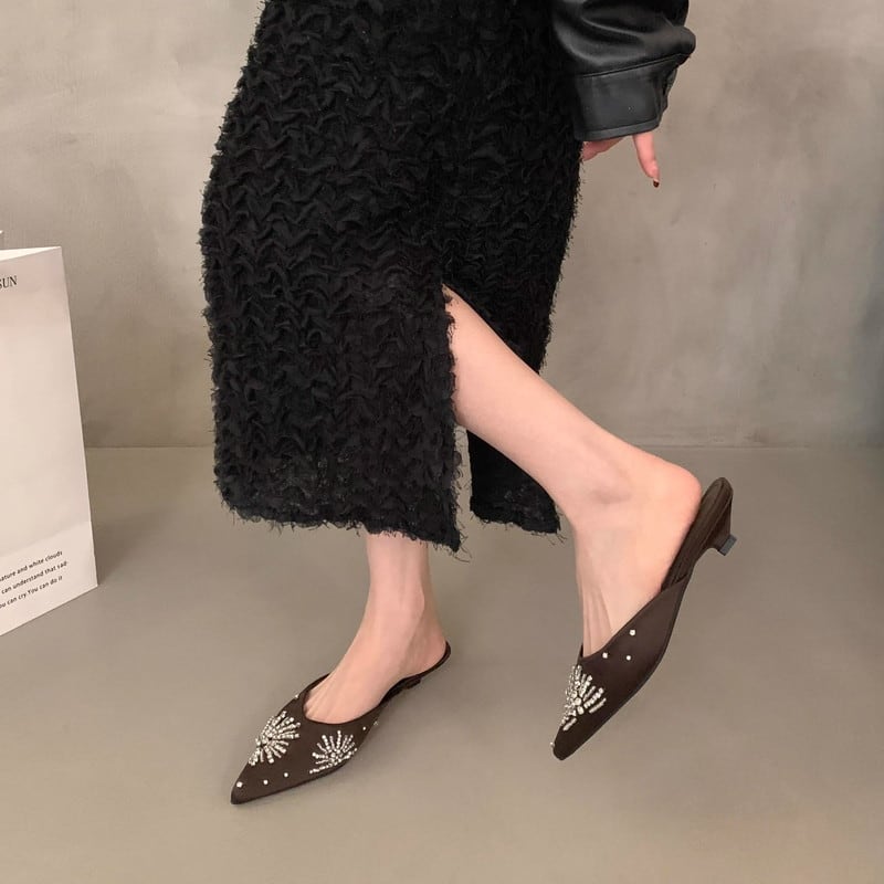 ▶︎ラインストーンモチーフが華やかな印象のポインテッドトゥミュール。