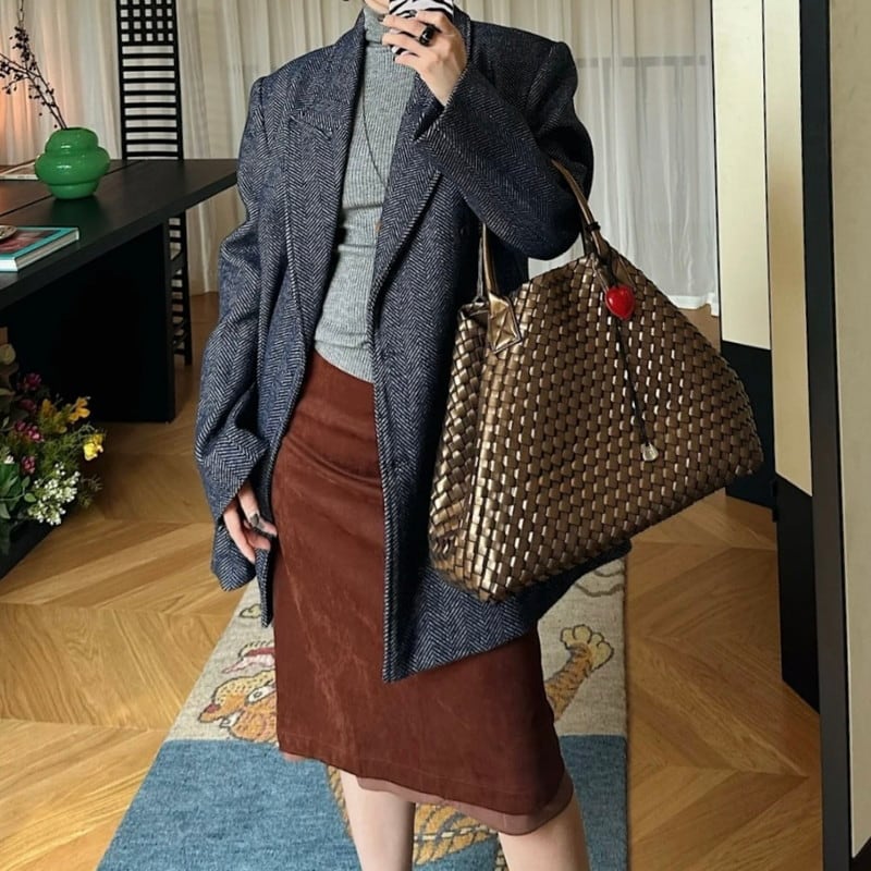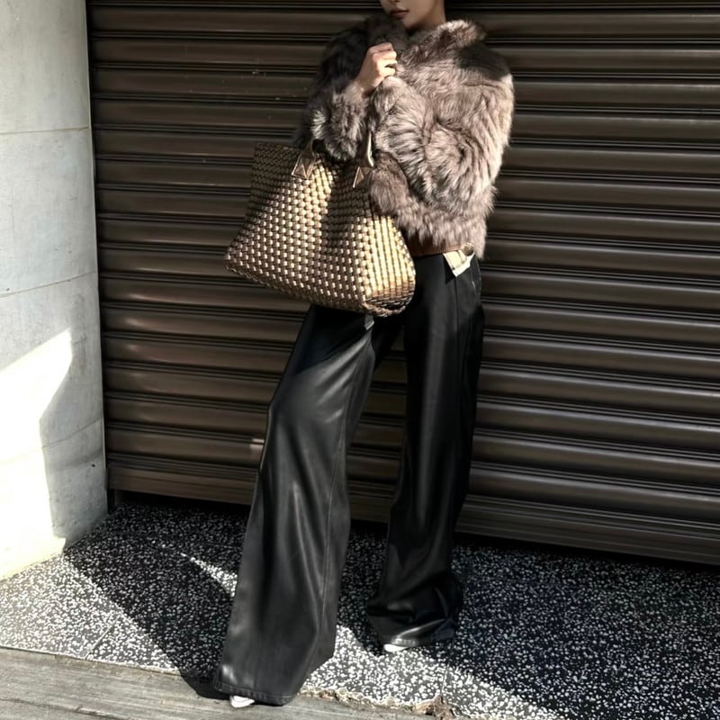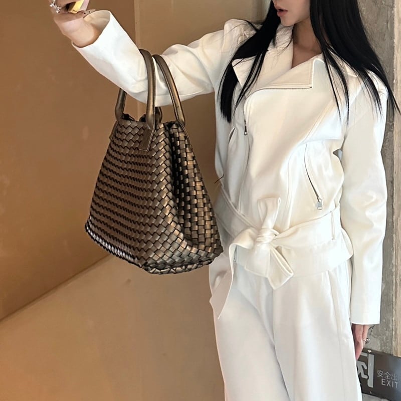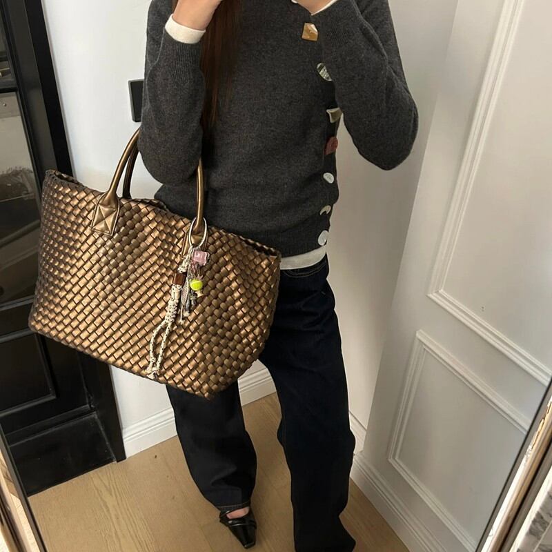 ▶︎編み込みデザインが目を惹く大きめトートバッグ。