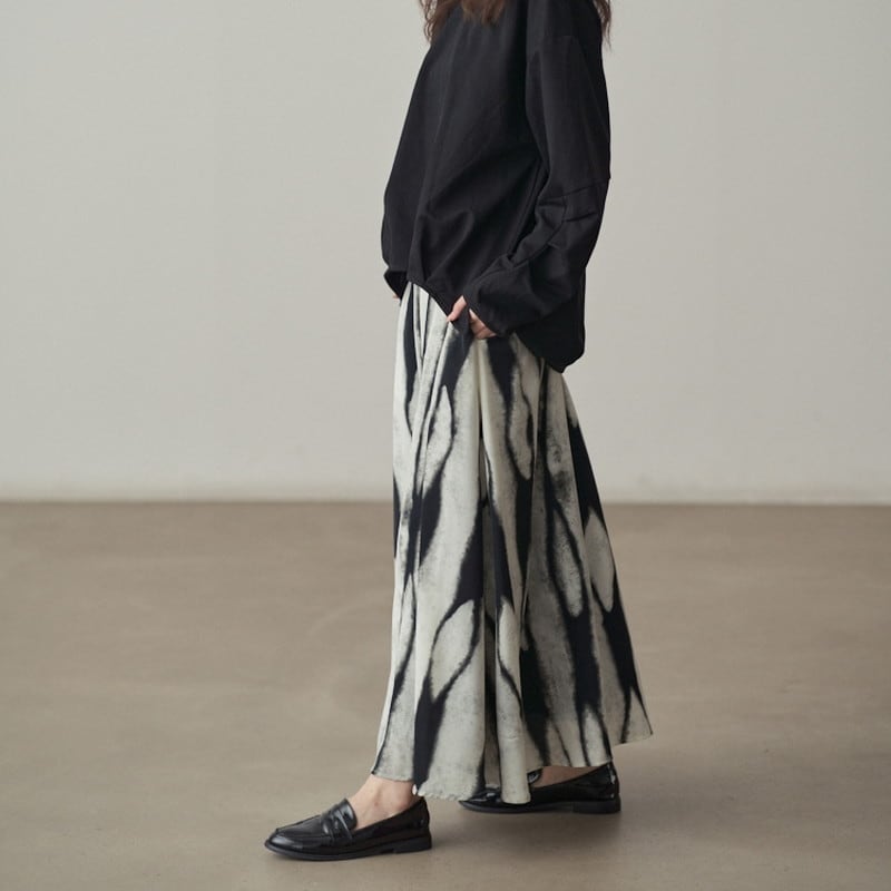 ▶︎タイダイ風のプリントが個性を引き立たせてくれるロングスカート。