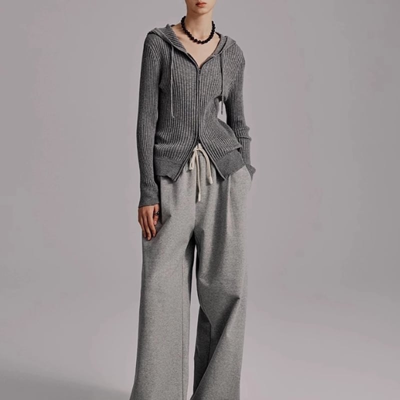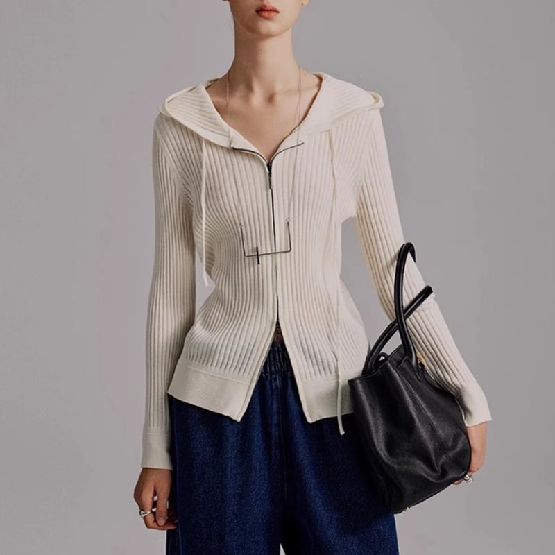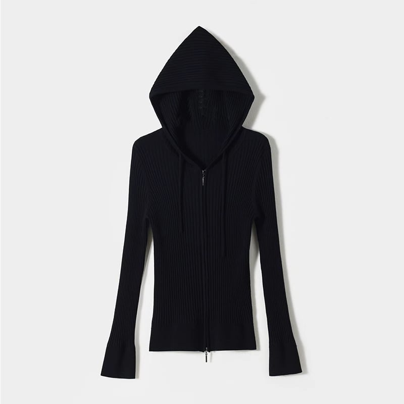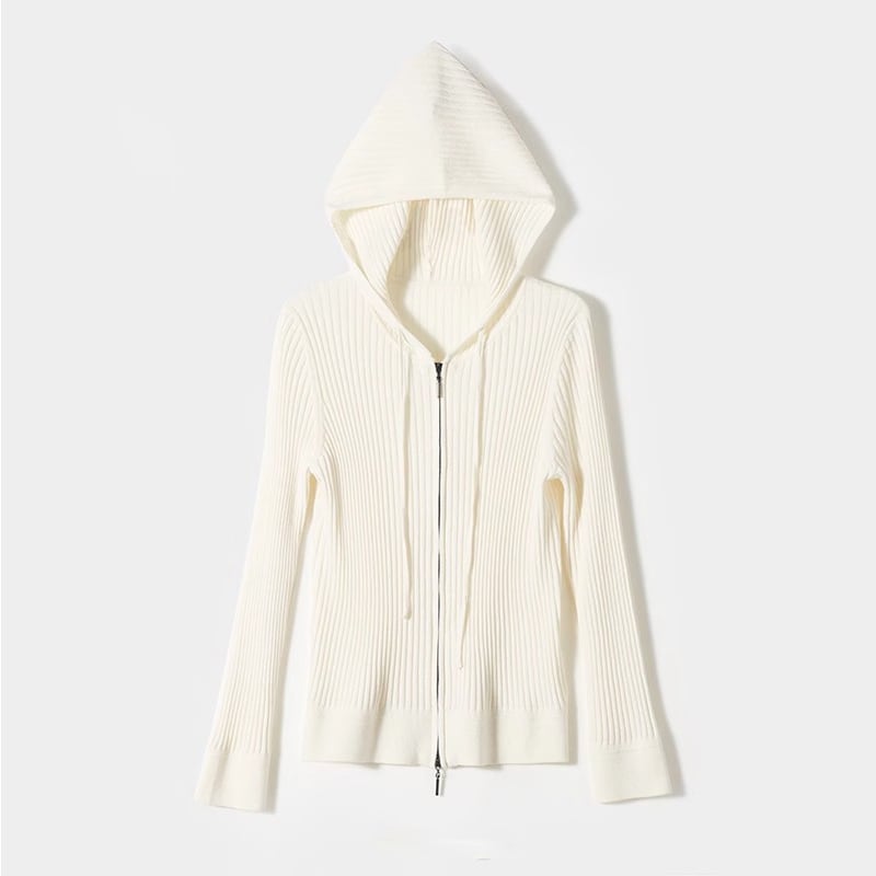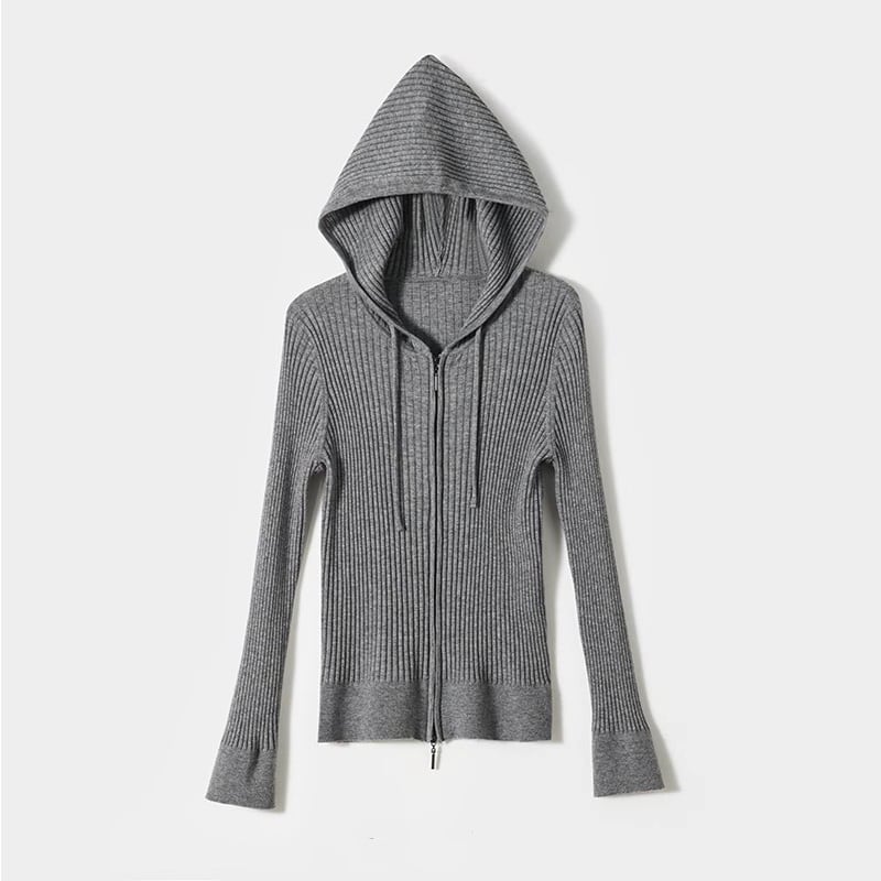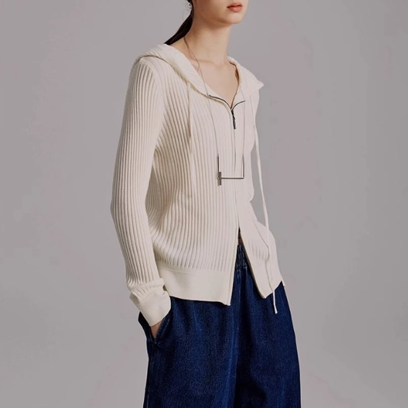 ▶︎細めのリブ編みがすっきりとした印象のダブルジップアップニットフーディです。