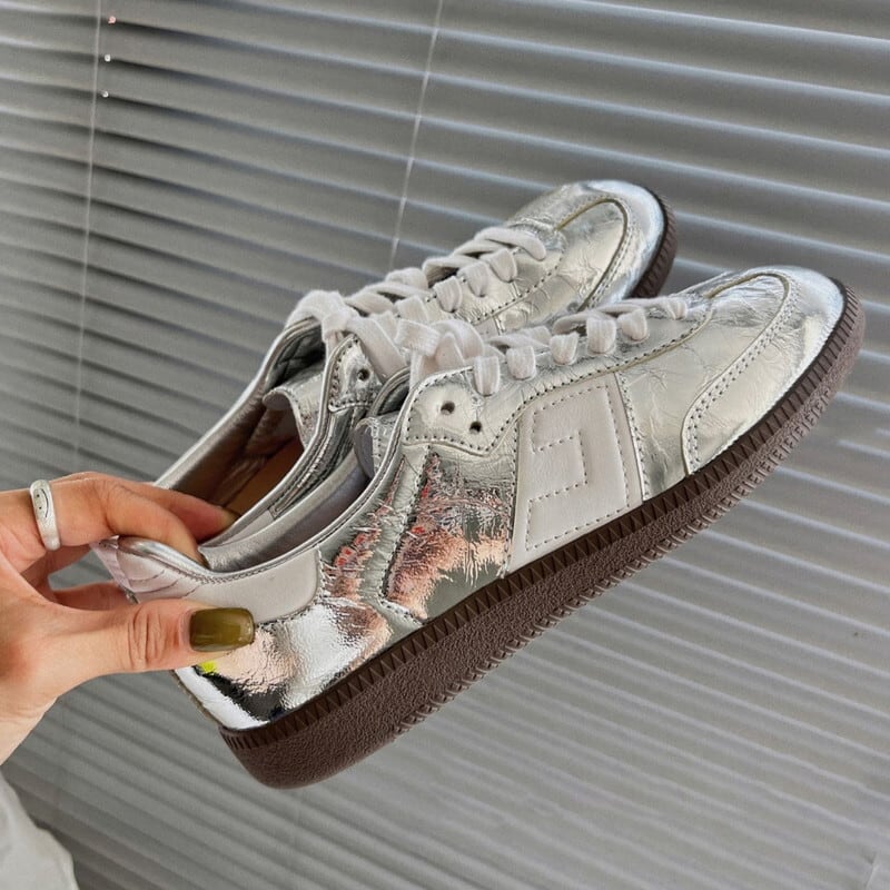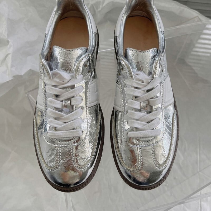 ▶︎メタリックな輝きがスタイリングに華やかさをプラスする、シルバースニーカー。