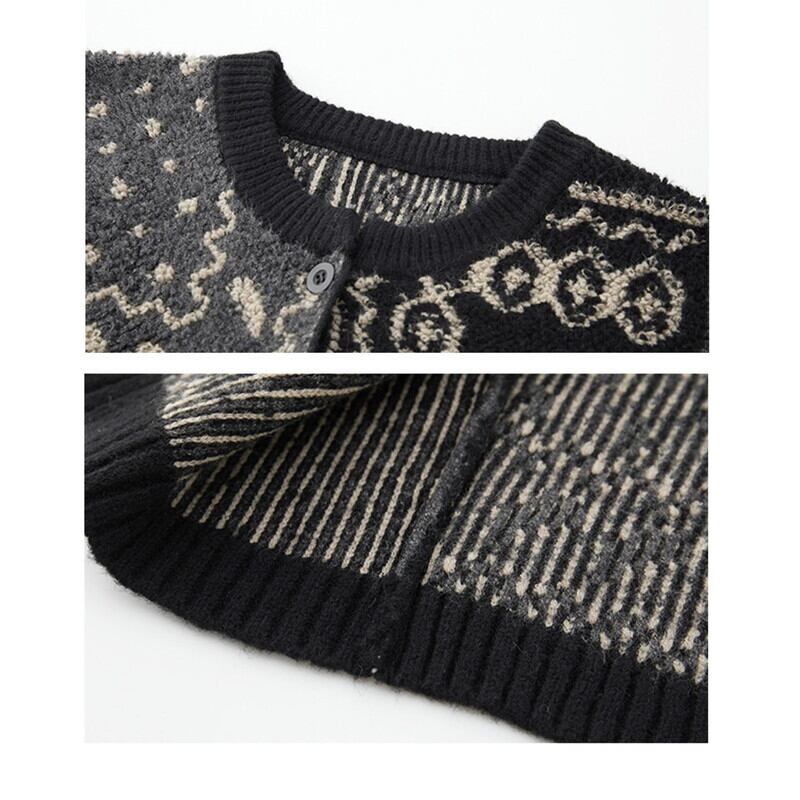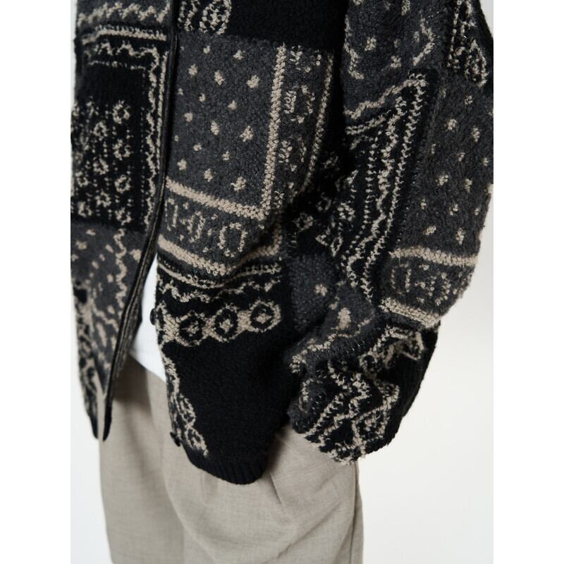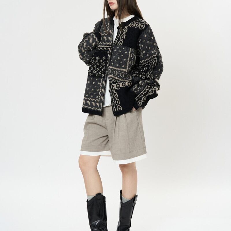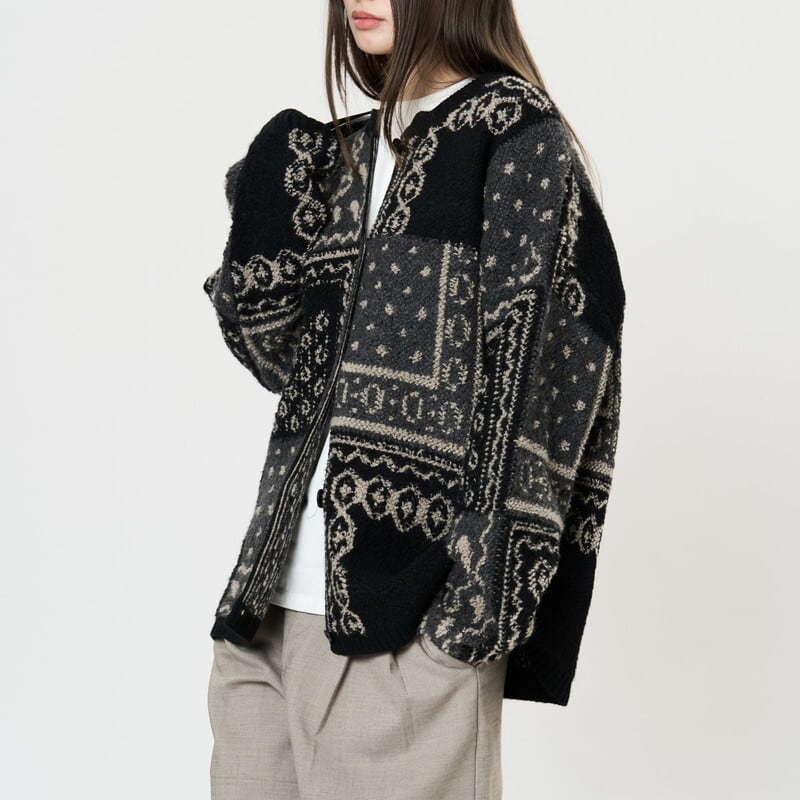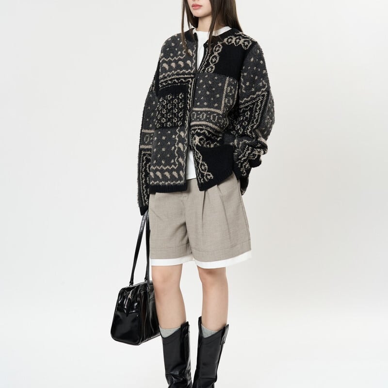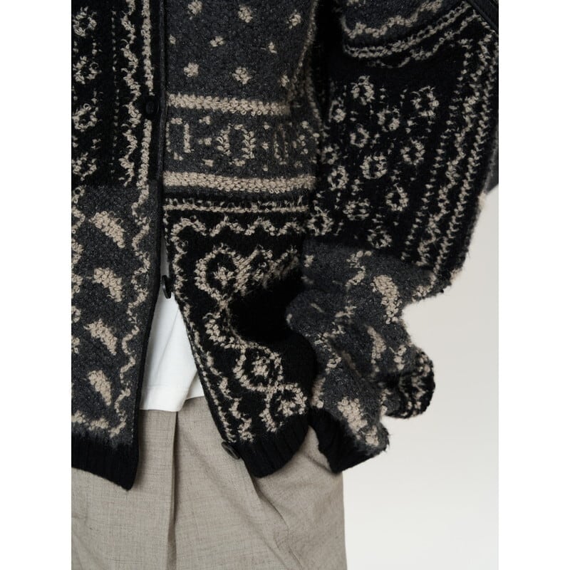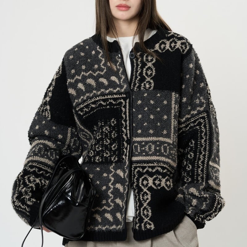 ▶︎存在感のある柄が目を引く、パッチワーク風カーディガン。