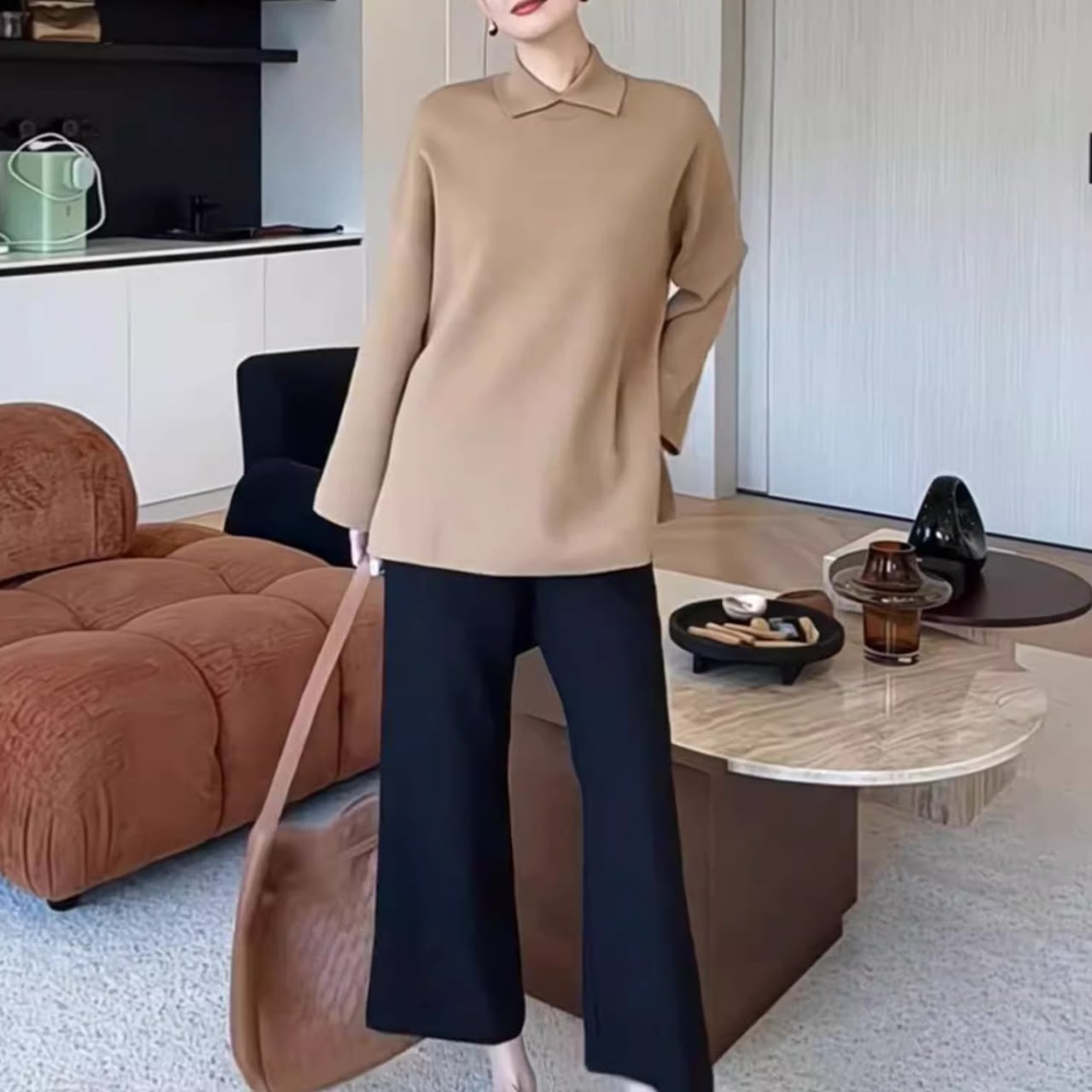 ▶︎女性らしい印象に仕上げた襟付きニット。