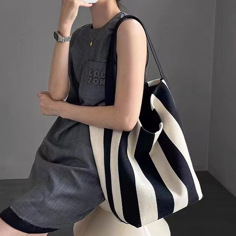 ▶︎コントラストの効いた大胆なワイドストライプが、装いにモダンなアクセントと都会的な品格を添えるトートバッグ。