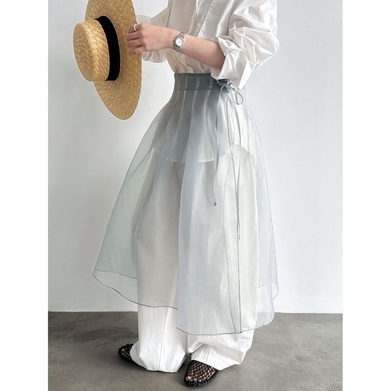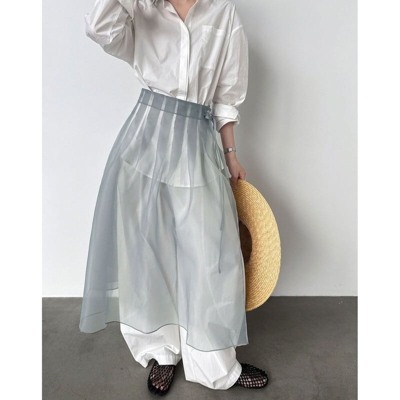 ▶︎軽やかで透け感のある生地が特徴で、パンツと重ねて着ることでトレンド感のあるスタイリングが楽しめる一枚。