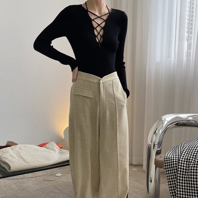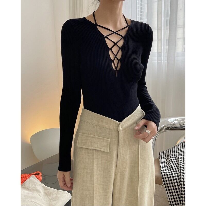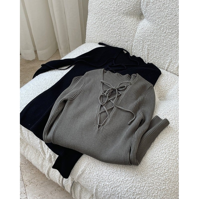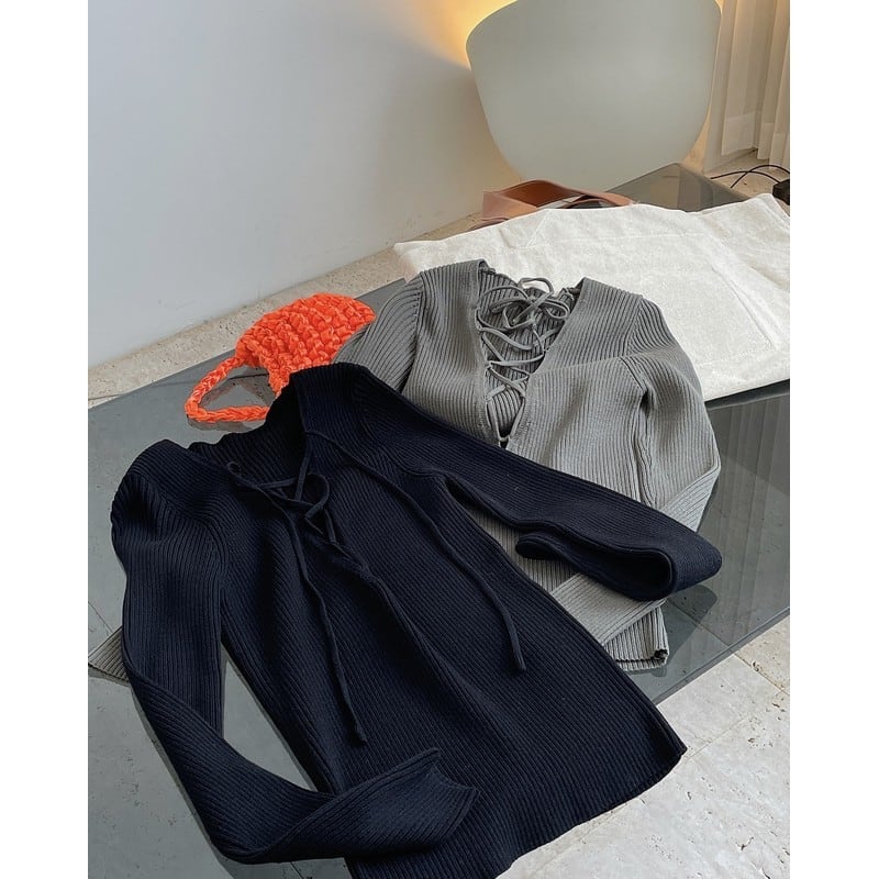 ▶︎胸元からデコルテを綺麗に見せてくれるレースアップのデザイン。ボリュームのあるボトムスでメリハリをつけたコーデがおすすめ。