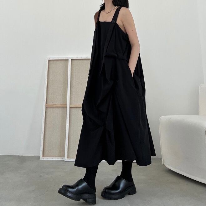 ▶︎シックな雰囲気漂う、サスペンダーワンピース。ブラックの無地デザインは、どんなシーンにもマッチし、お洒落な大人の女性にぴったり。アシンメトリーデザインが、差のつくおしゃれ感を演出します。