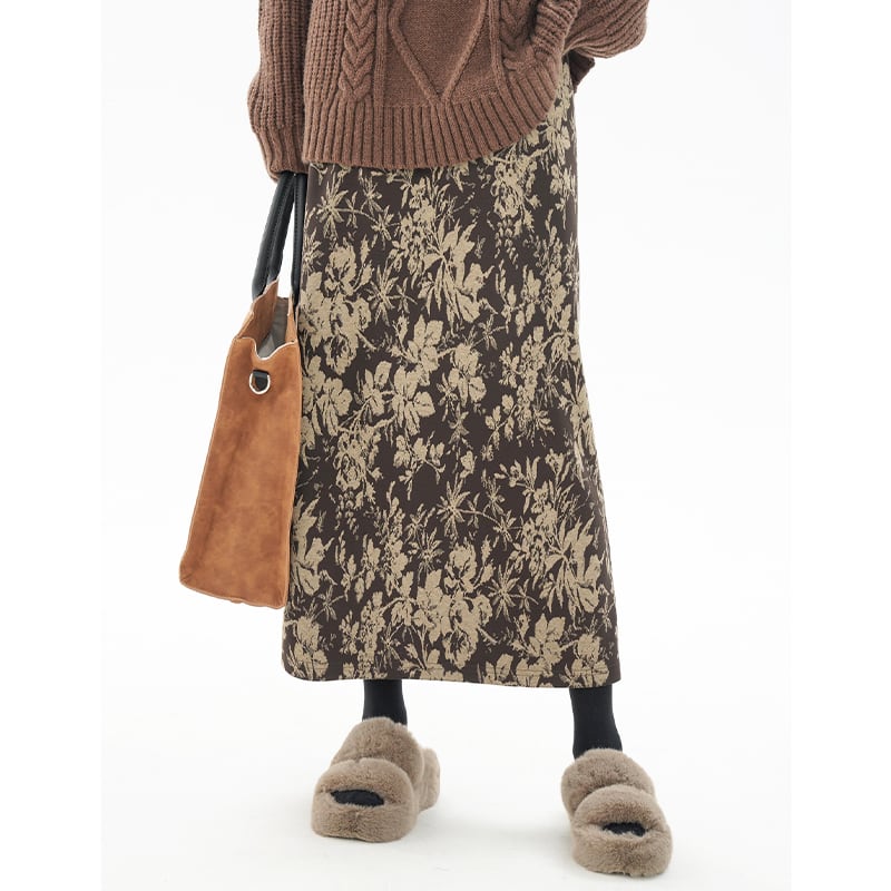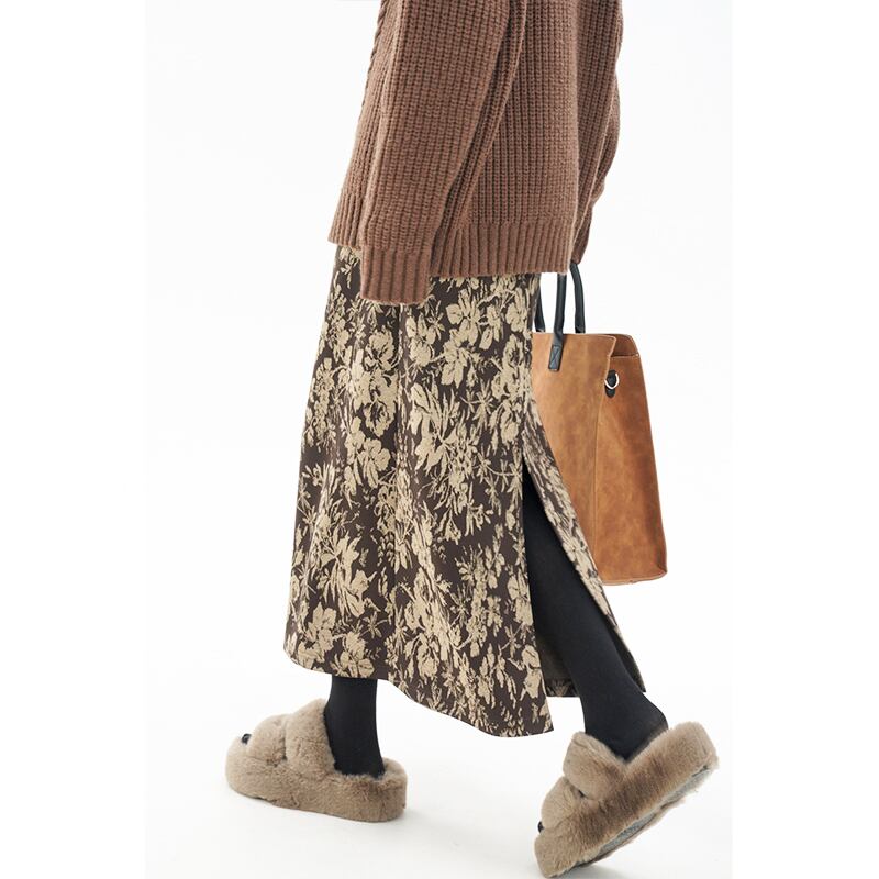 ▶︎ レトロなプリントでシックに着こなせるタイトスカート。ワントーンで色合わせがしやすくコーディネートしやすいのも魅力的ポイント。