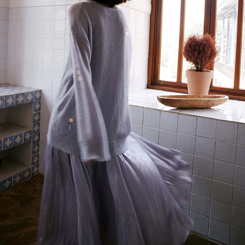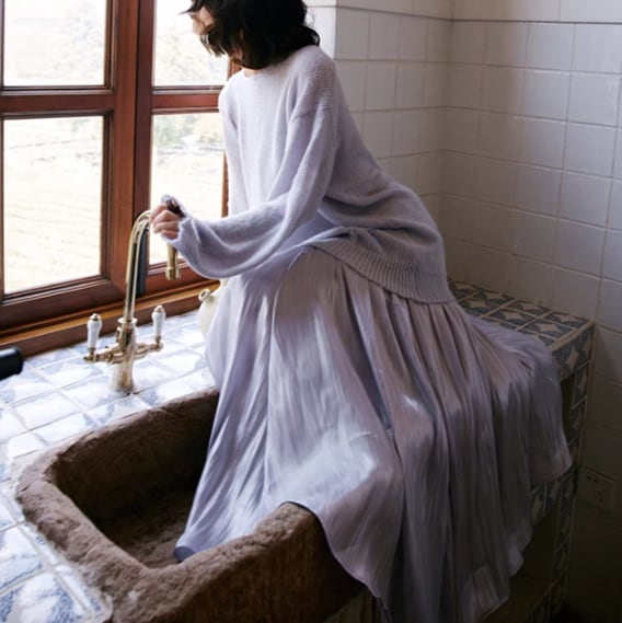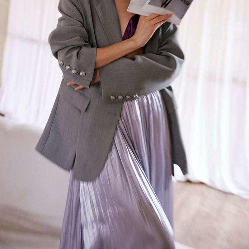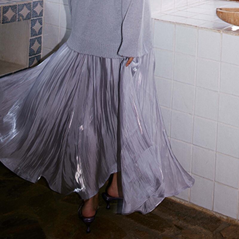 ▶︎上品な光沢あるカラーに目を惹かれるスカートが登場。