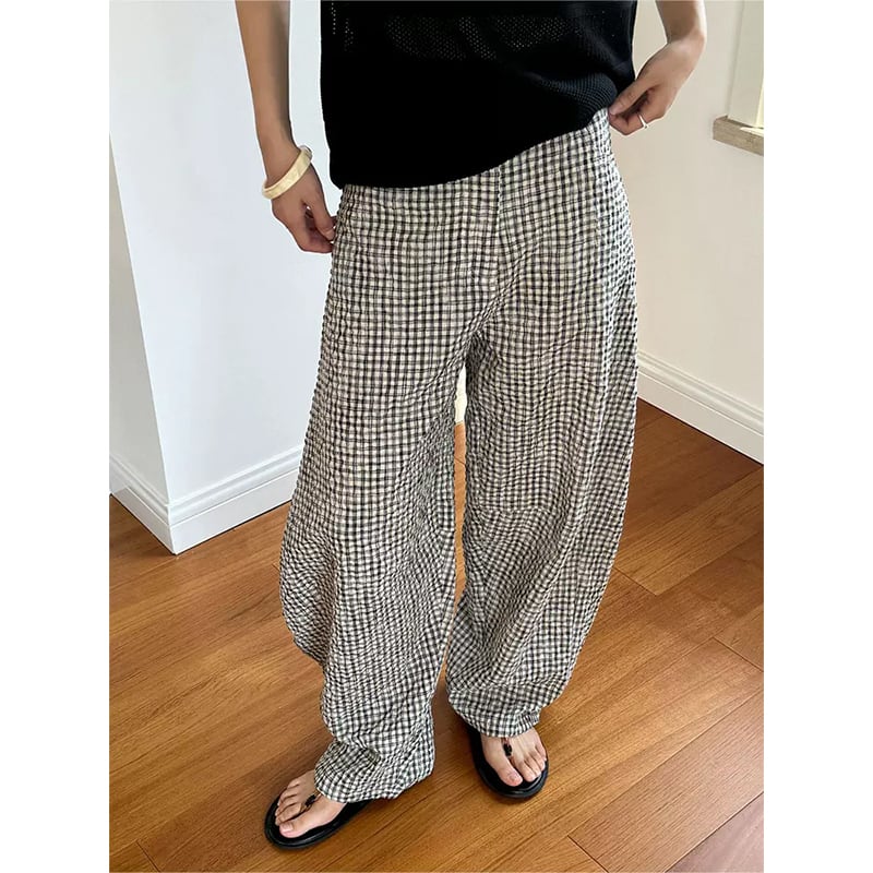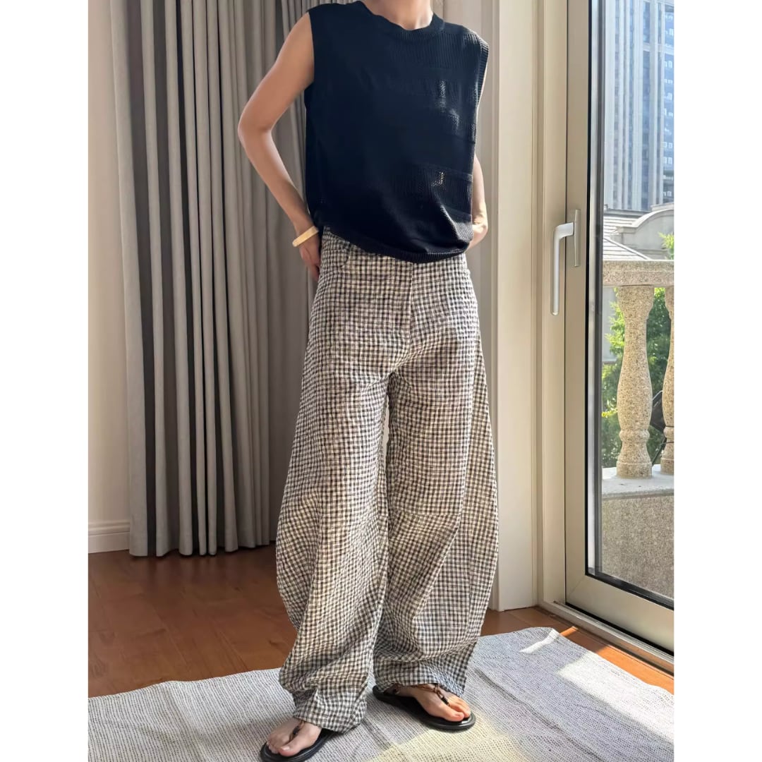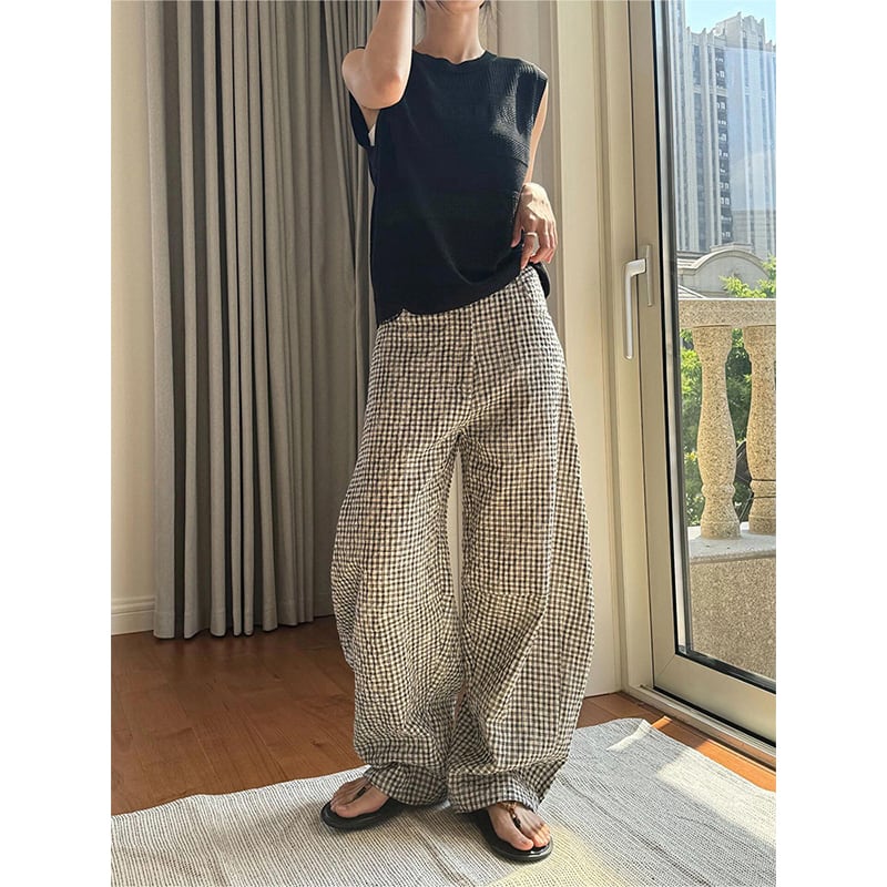 ▶︎トレンドのカーブシルエットがシンプルなスタイリングのアクセントになってくれるギンガムチェックパンツ。