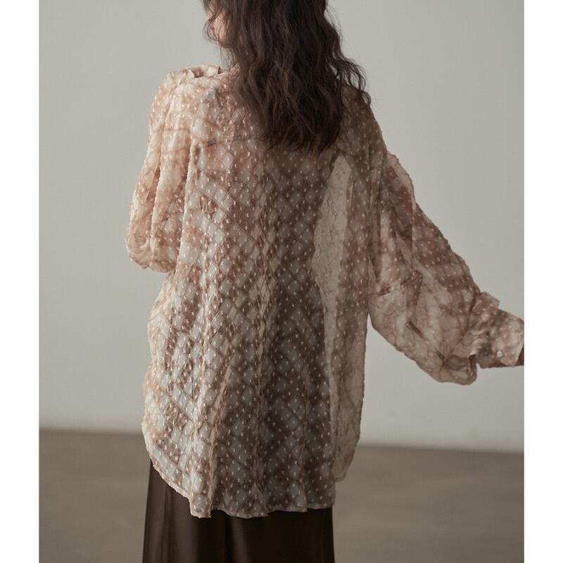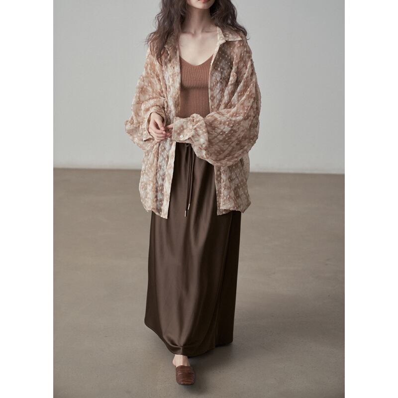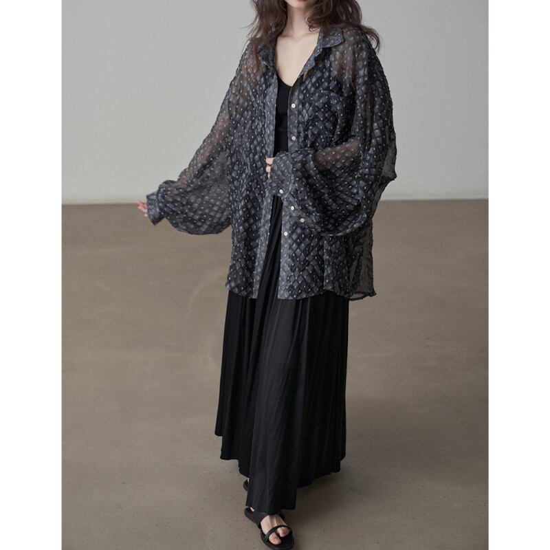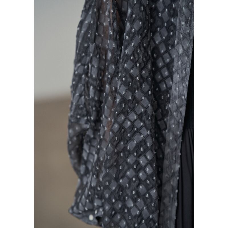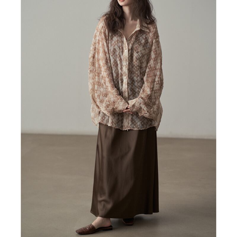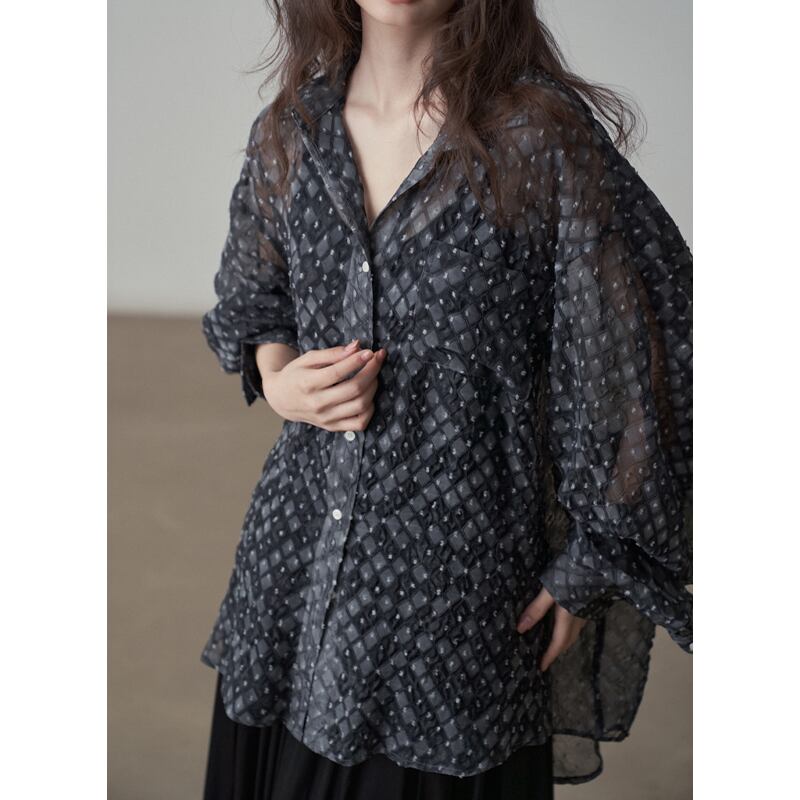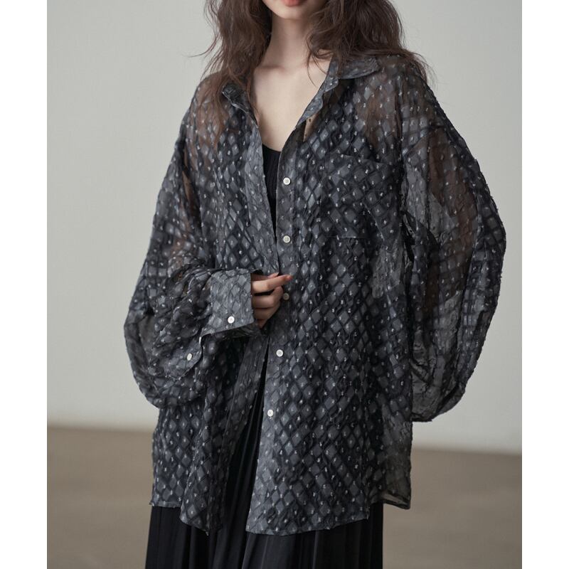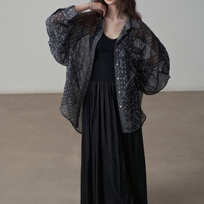 ▶︎透け感だけでなく個性的なプリントがさらにエッジの効いたモードな雰囲気をつくるアイテム。