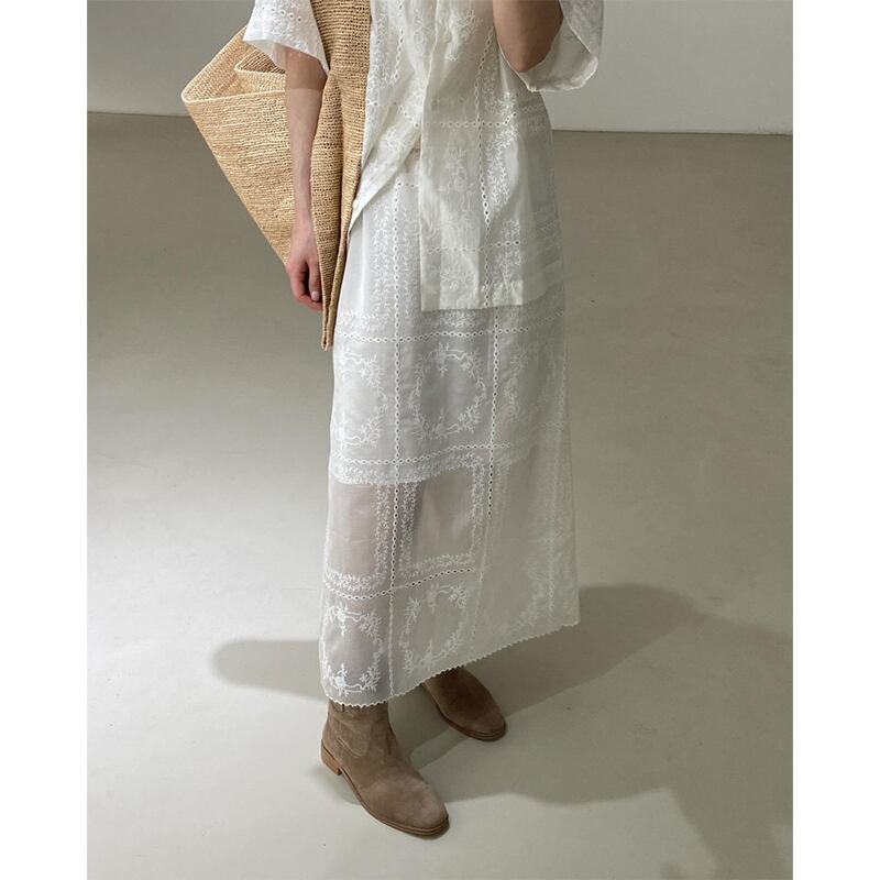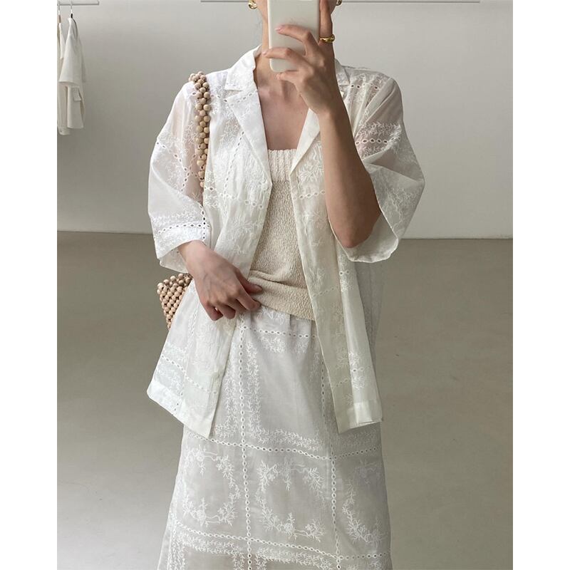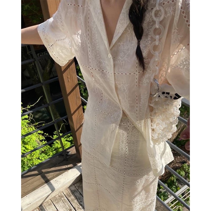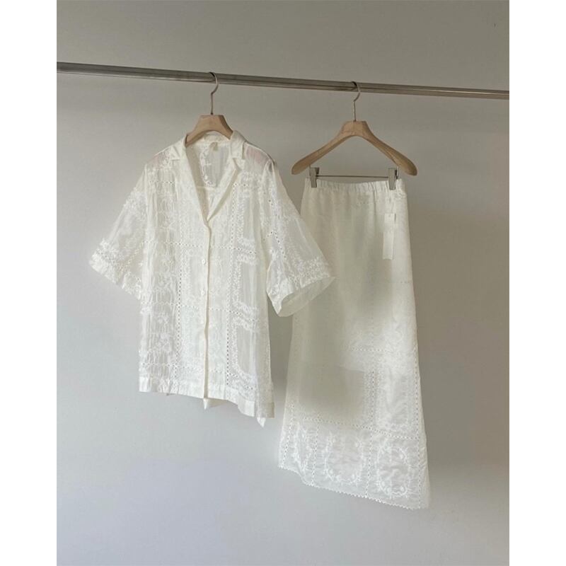 ▶︎ボタニカルモチーフのレース×シアー素材が抜け感のあるセットアップ。