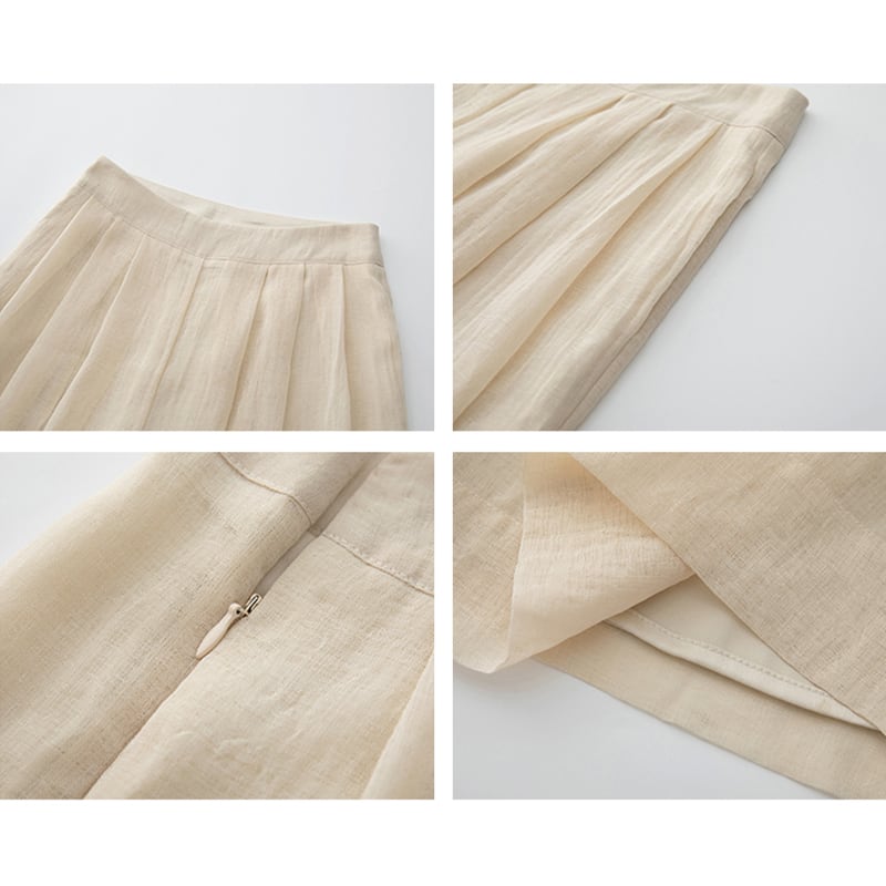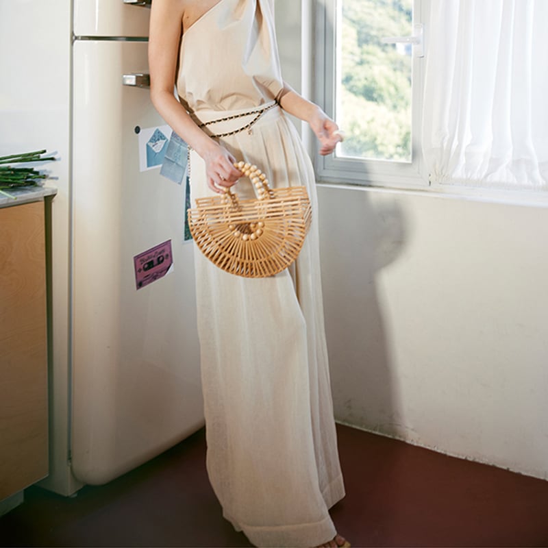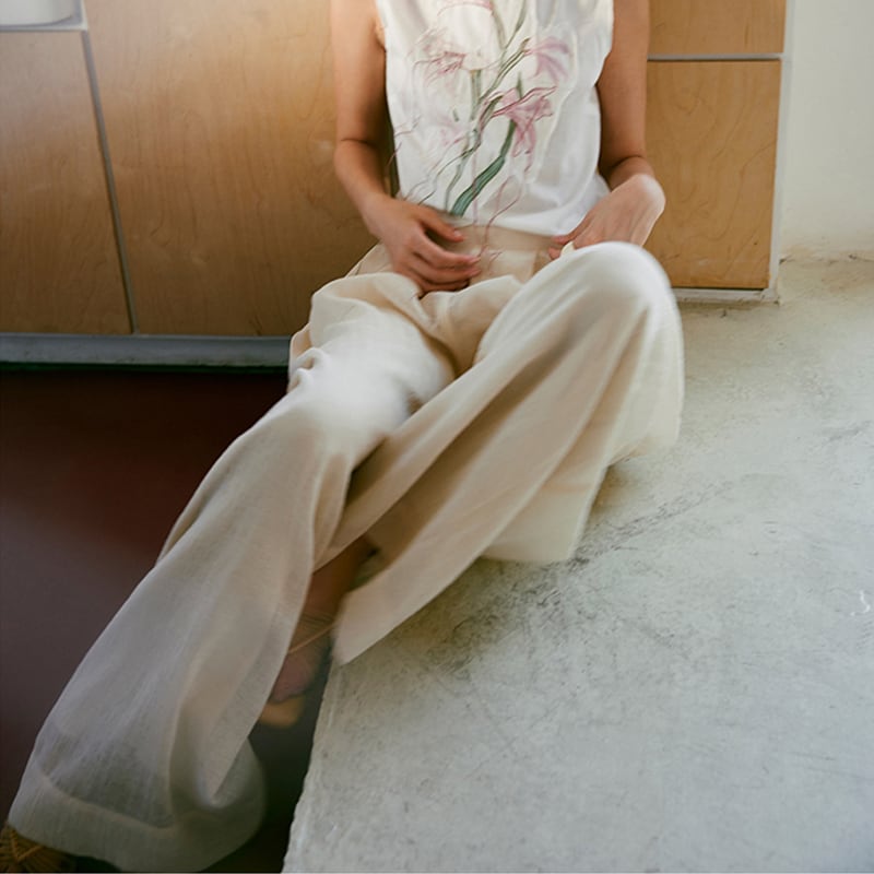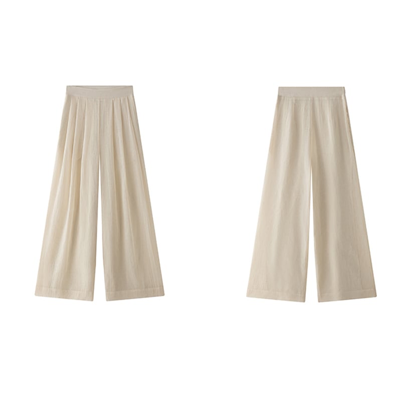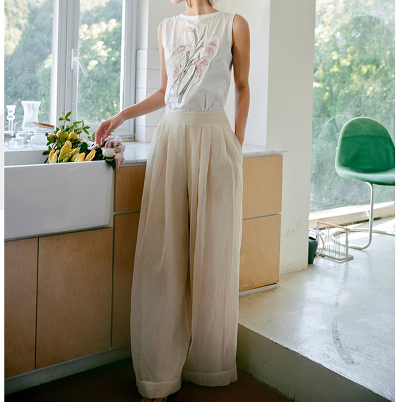 ▶︎一枚で上品なこなれ感を演出するシアーワイドパンツ。